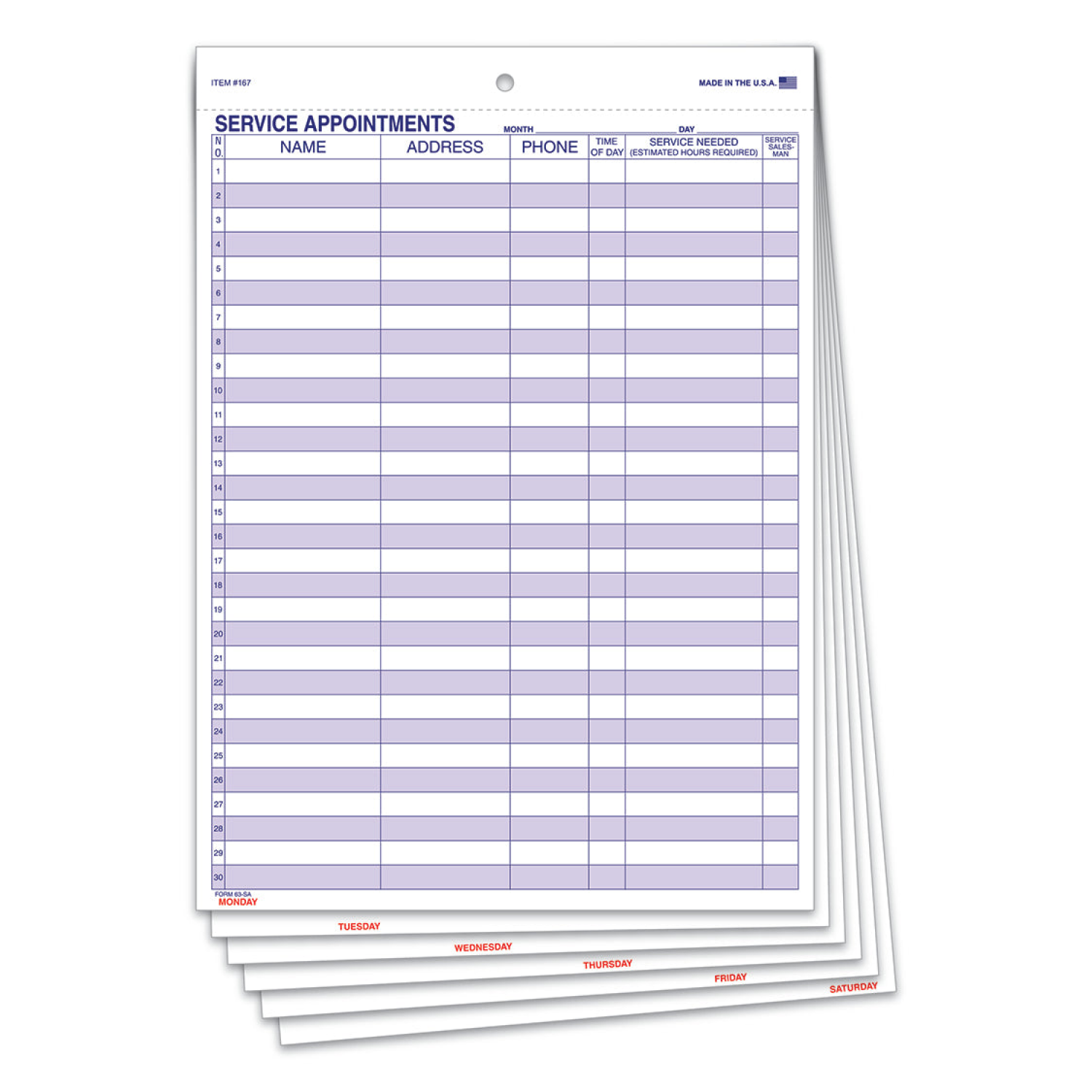 An easy way to organize and schedule daily work. Each sheet is identified from Monday through Saturday. 30 lines per side, 60 lines per day total.