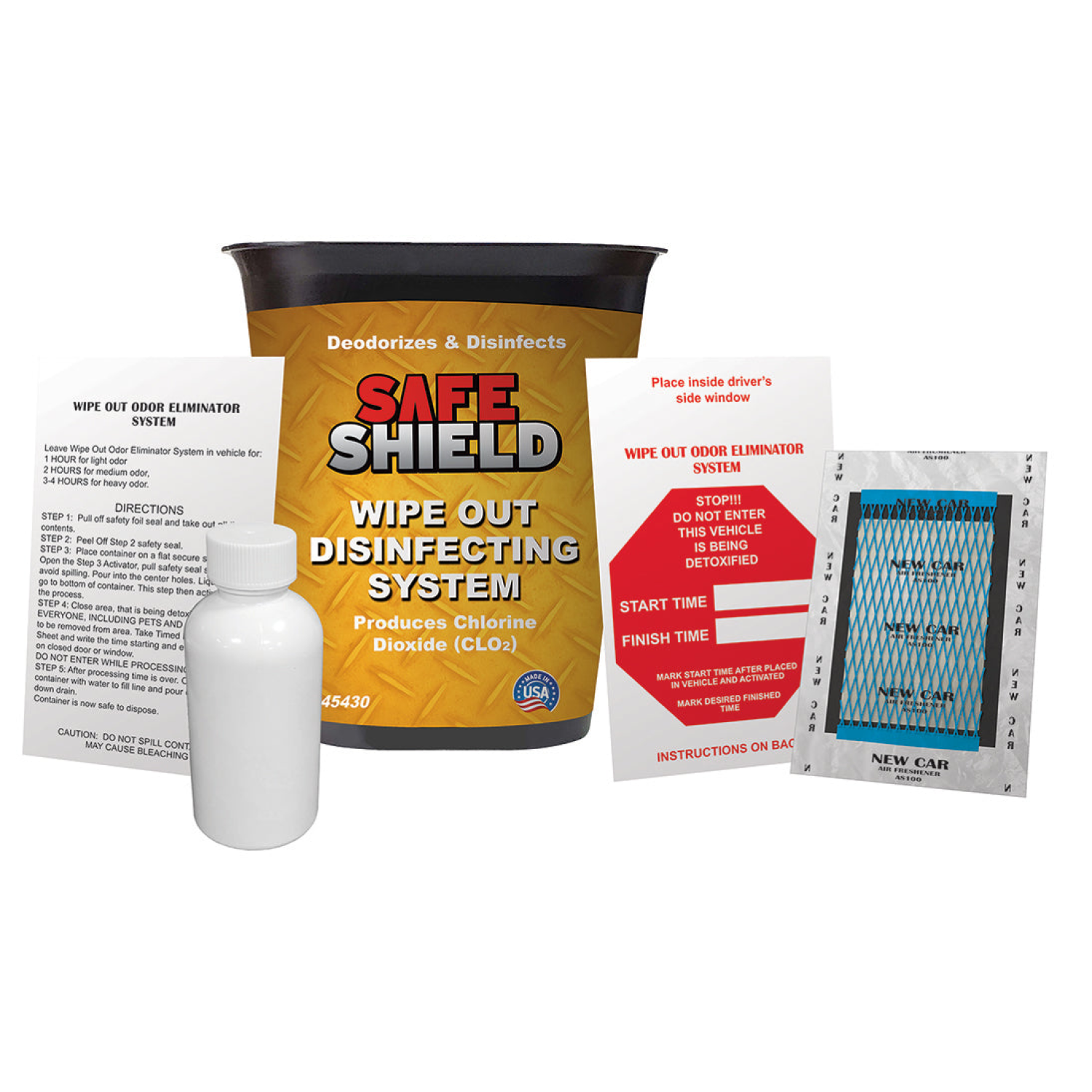 Wipe Out Odor Eliminator System vaporizes, decontaminates, disinfects, and deodorizes. This quick release product uses chlorine dioxide to penetrate the air and deeply into any materials including metal and plastic, making automobiles smell new again.