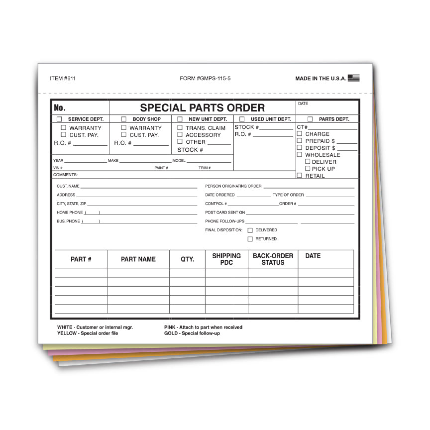This unique special parts order form tracks the part on order and includes a postcard mailer to notify the customer.
