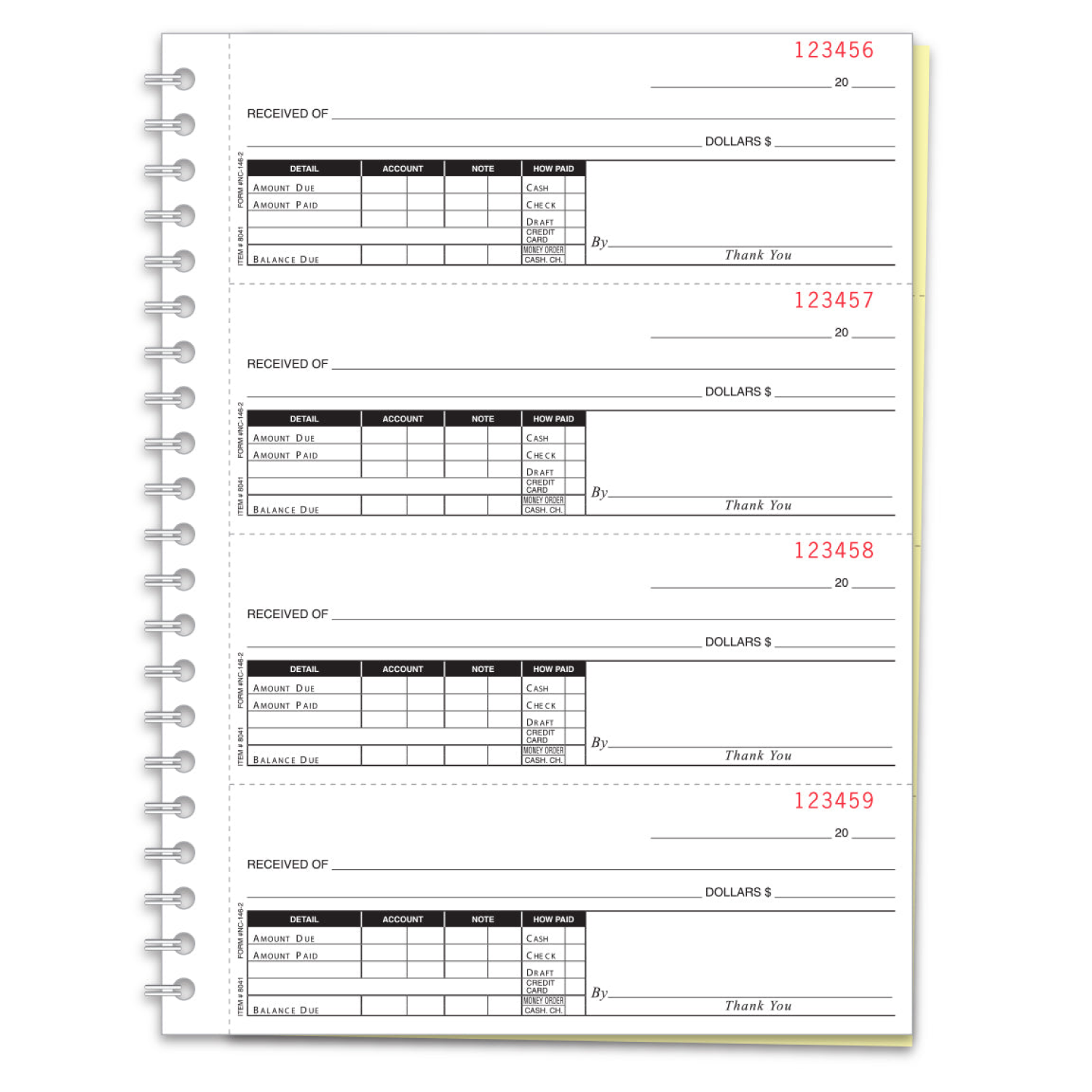 This is a 2-part or 3-part cash receipt book. All pages are 8-1/2" x 11" with 4 receipts per page or 200 receipts per book. Non-imprinted stock is pre-numbered in red. (No choice of starting number.)