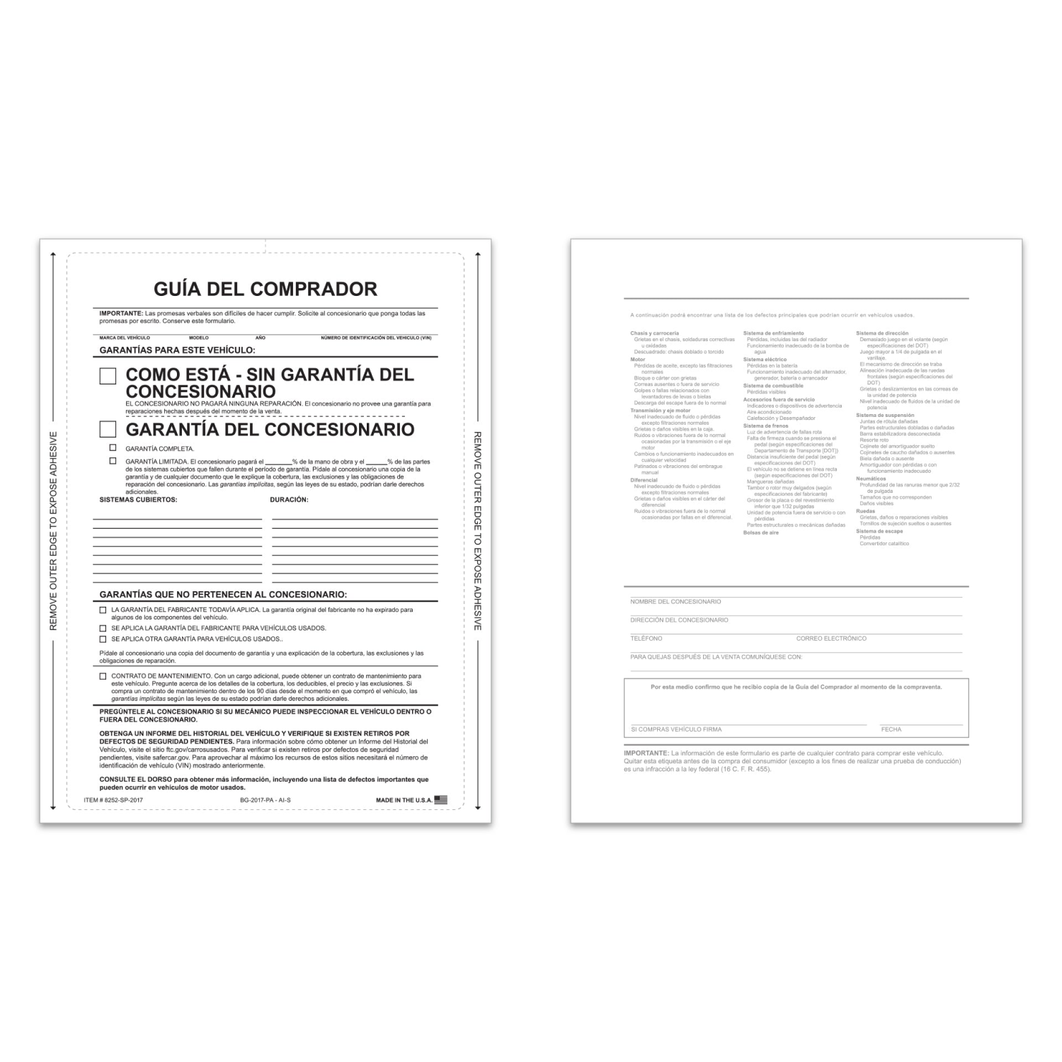 These fade-resistant Buyers Guides have “Permanent Adhesive On All 4 Sides” to adhere to the inside or outside of the vehicle window. Stay in compliance with current FTC regulations with these easy to use forms. These popular forms are laser compatible and easy to remove.