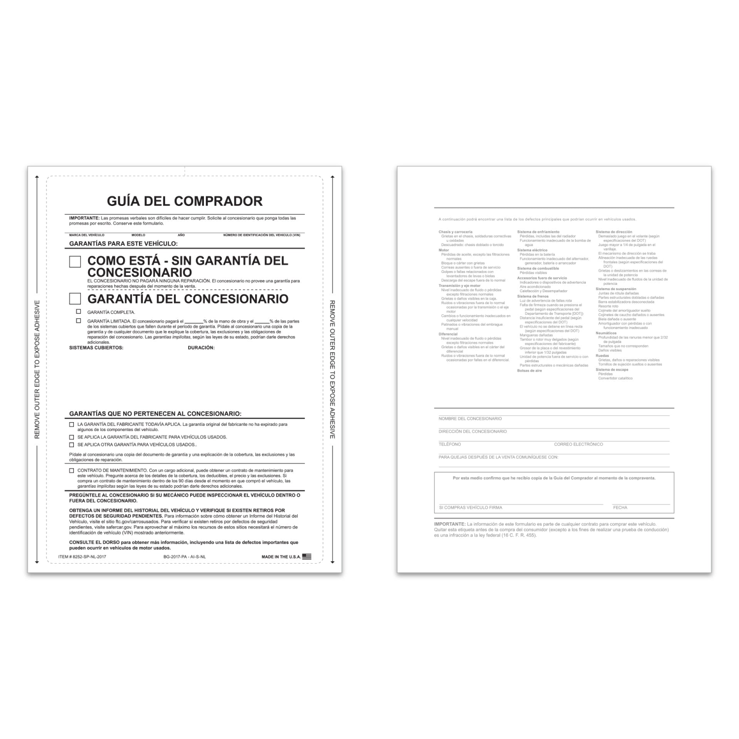 These fade-resistant Buyers Guides have “Permanent Adhesive On All 4 Sides” to adhere to the inside or outside of the vehicle window. Stay in compliance with current FTC regulations with these easy to use forms. These popular forms are laser compatible and easy to remove.