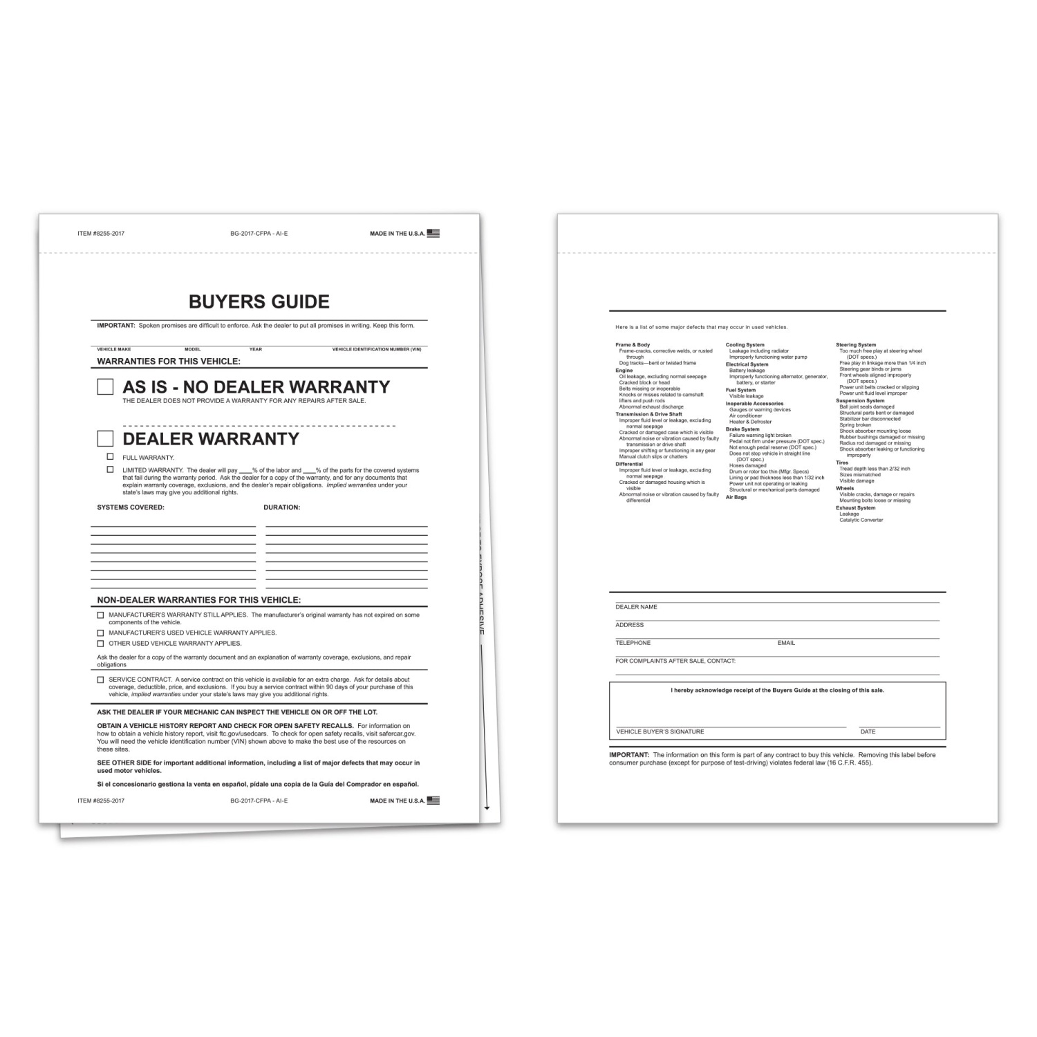 This Buyers Guide is the best of both forms! Part 1 is for filing or customer use and part 2 is adhesive stock that seals on all 4 sided to the inside of the vehicle's window. It is also perforated for easy removal from the window.