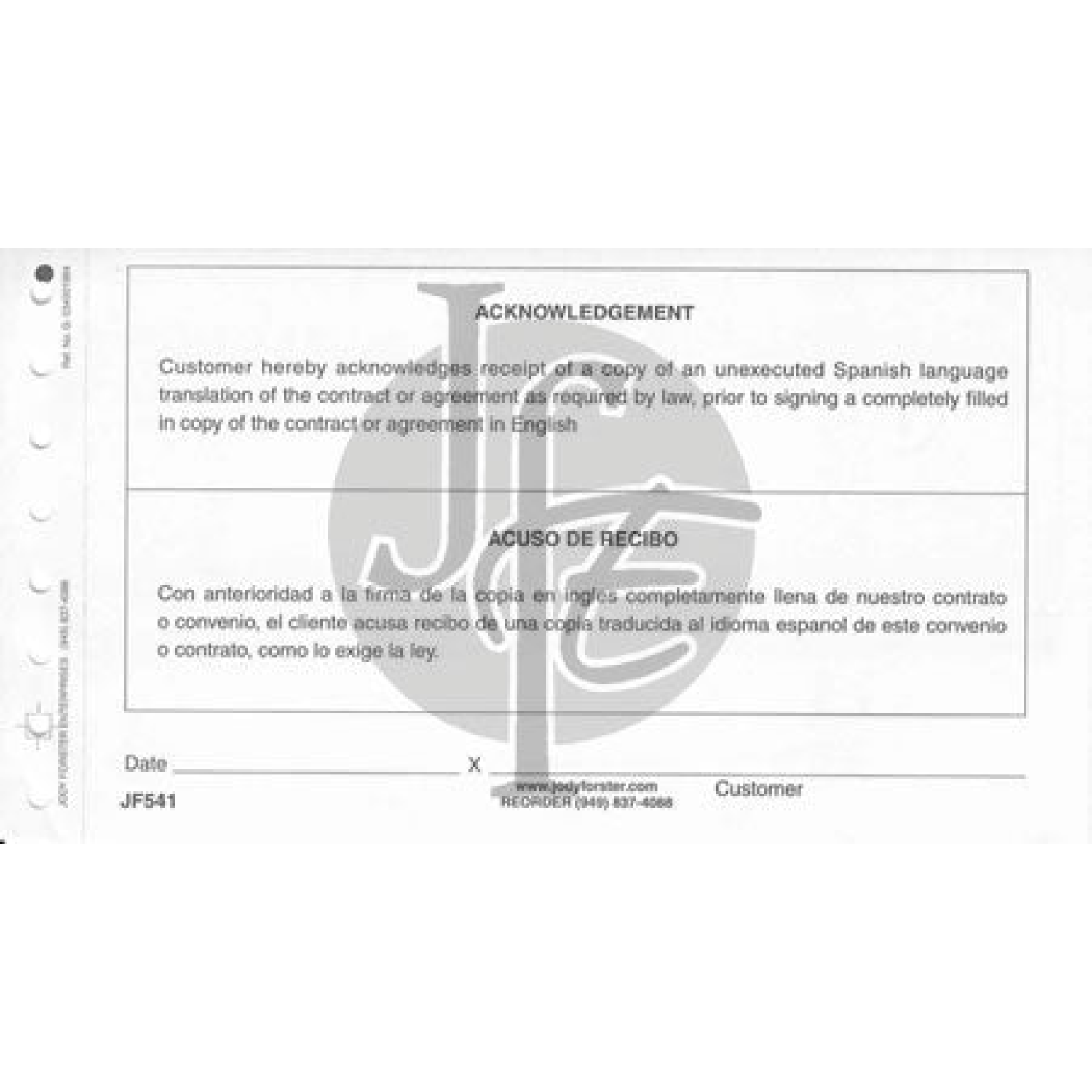 - Protect your dealership by recording distribution of documents translated in the Spanish language (such as security agreements, buyers guides, and DMV forms), in accordance with California Law. 7" x 4 1/4" - 2 part - 100 pkg.