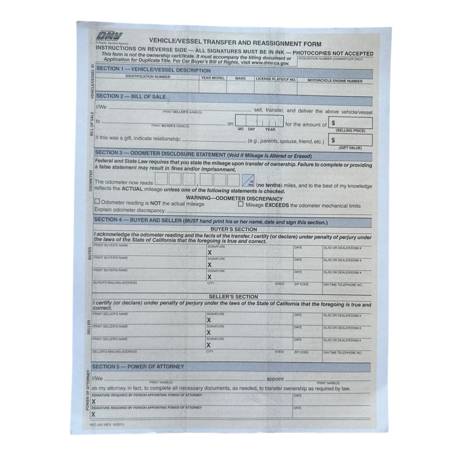 The CA Reg 262 Form is a required document for transferring ownership of a vehicle in California. Easy to fill out and accepted by all California DMV offices. Order yours today and make the vehicle transfer process a breeze!